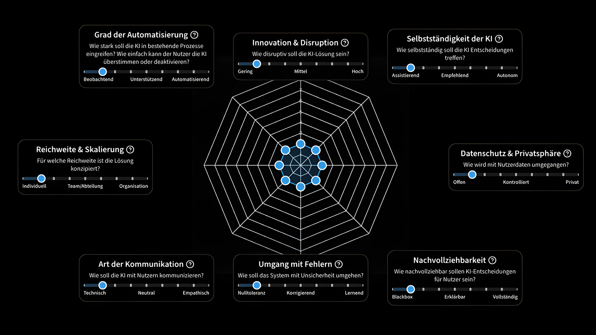 Durch das Konfigurieren der Skalen entstand dann jedoch ein gemeinsames Bild. Die KI sollte kein autonomer Co-Pilot werden und auch keine emotionale Figur verkörpern. Stattdessen formte sich die Vision eines situationsbewussten Service-Guides, der: